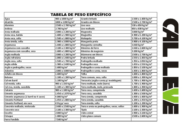 Tabela Massa Especifica Construcao